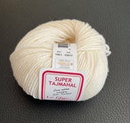 Super Tajmahal 70% Merinoull 22% Siden 8% Kashmir.50gram = 115 meter, stickor 5-5,5 masktäthet 18x28m=10cm.Vit